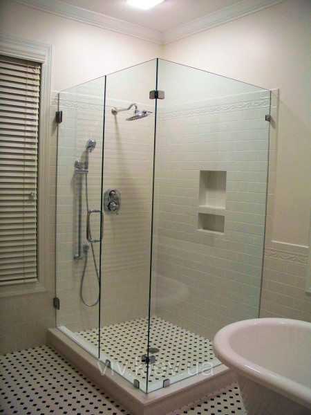 - Разместите стекла кабинки в пазы направляющих, все стыки нужно смазать герметиком. После этого затяните винт на прижимной лапке.