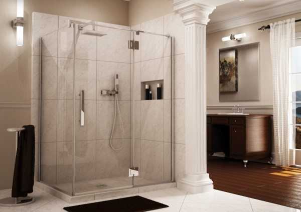 - Идеальный вариант для тесных помещений – приобретение и монтаж душевой кабины с угловым расположением. Это оборудование прекрасно впишется в дизайн современной ванной комнаты, не мешая установке другого сантехнического оборудования.