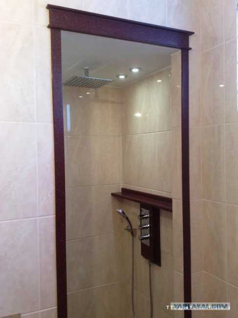Дизайнеры не рекомендуют устанавливать зеркало внутри душевой кабинки. Подобный вариант оригинально выглядит только на фотографиях. В реальной жизни зеркало довольно быстро потеряет свой естественный блеск, ни о какой эстетике речи не пойдет. Оптимальным вариантом будет крепление зеркала напротив кабинки, то есть на противоположной стене.