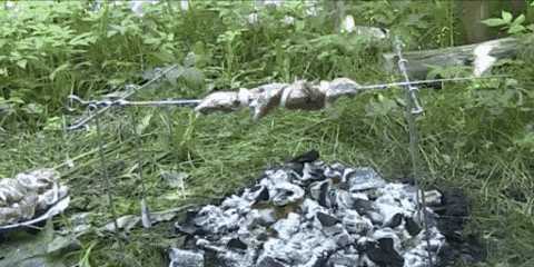 kak-sdelat-vse.comРазведите костёр. Когда угли будут готовы, положите по краям два бревна параллельно друг другу. Расстояние между ними должно быть не очень большим. Затем поместите на брёвна шампуры с мясом.