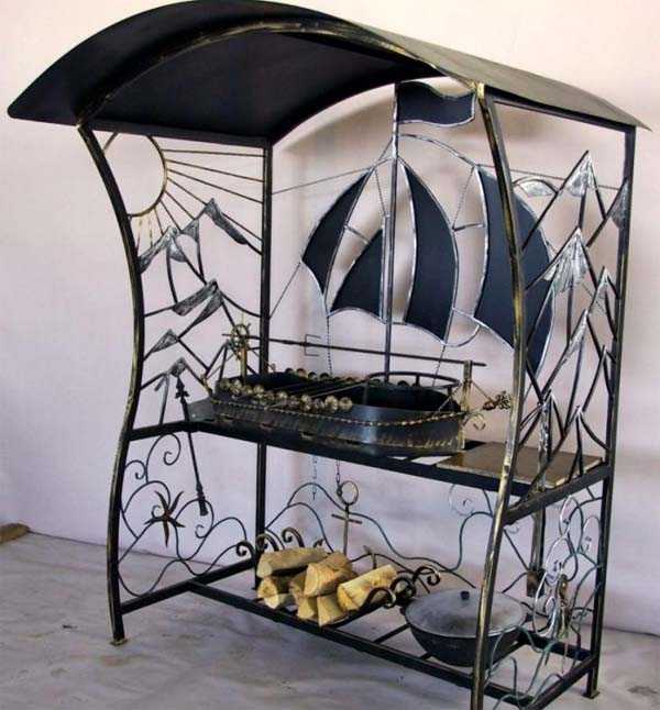 Ну и последний тип, это так называемые узорчатые и кованые фигуры. Изготовить такой мангал с дымоходом собственноручно очень сложно, не обладая навыками в ковки. Как правило, место для таких печей выбирают стационарное, ведь из-за общего веса, переносить такие конструкции с места на место, достаточно сложно.