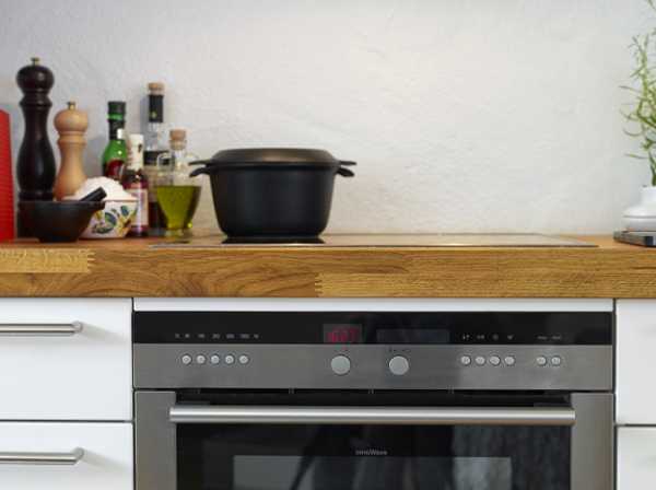 Деревянная столешница великолепно сочетается с белоснежными современными фасадами