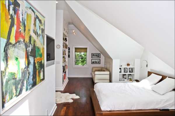 - Наклонная крыша отбирает больше пространства, поэтому такому помещению нужно больше света, который можно создать с помощью грамотного искусственного освещения.