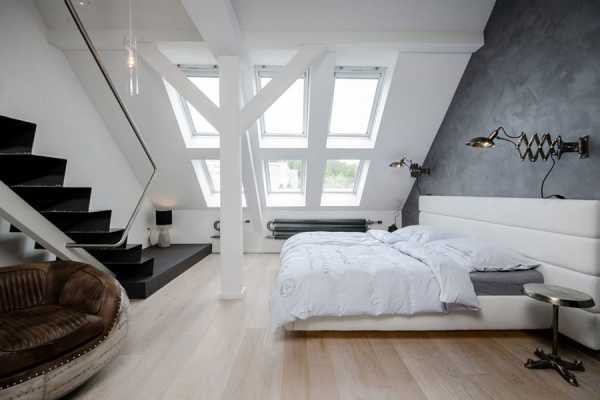 Стоит с осторожностью делать вертикальные и горизонтальные цветовые полосы, поскольку вместо увеличения пространства, они могут привести к противоположному результату. Помимо этого, белый цвет поможет сделать последний этаж более светлым, что особенно актуально при недостатке естественного освещения. К тому же, сейчас в моде скандинавский стиль, при котором не только верх, но и стены комнаты окрашивают в белоснежный цвет.