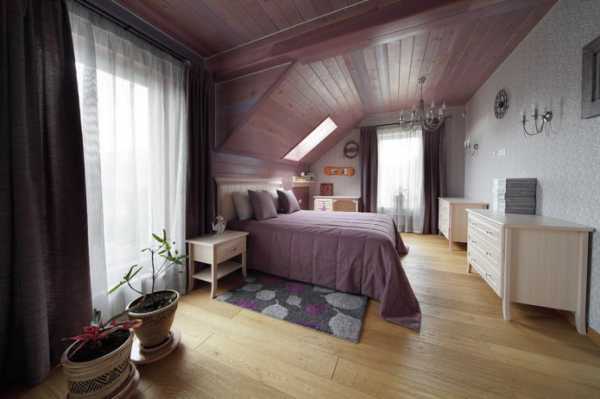 На фото деревянный потолок с окном, окрашенный в сиреневый цвет в интерьере спальни на мансарде.