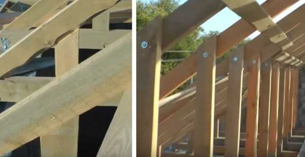 С одной стороны ригели крепятся встык, с другой — внахлест к стропилам