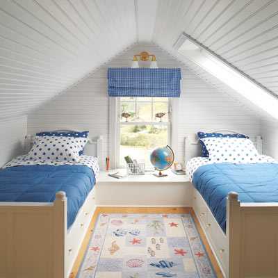 Довольно популярный в последнее время стиль при оформлении чердачных пространств. Сочетание белого с синим, бирюзовым, зеленым и оттенками бежевого рождает ощущение открытого пространства, свежего бриза, легкости и отпускного настроения. Узор полоской позволяет зрительно скорректировать недостатки помещения.