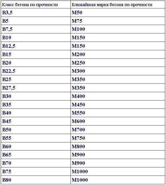 Чтобы не быть голословными, хотелось бы представить таблицу, в которой можно проследить соответствие марки и класса бетона.