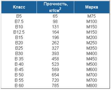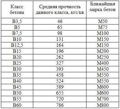 Таблица соответствия класса и марки бетона: