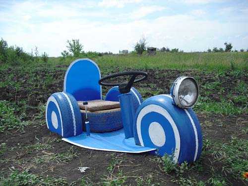 ΠΠΎ ΡΡΠΎΠΌΡ ΠΆΠ΅ ΠΏΡΠΈΠ½ΡΠΈΠΏΡ ΠΌΠΎΠΆΠ½ΠΎ ΡΠ΄Π΅Π»Π°ΡΡ ΡΠ²ΠΎΠΈΠΌΠΈ ΡΡΠΊΠ°ΠΌΠΈ Π½Π΅ΠΎΠ±ΡΡΠ½ΡΠΉ ΠΌΠΎΡΠΎΡΠΈΠΊΠ» Π΄Π»Ρ Π΄Π΅ΡΡΠΊΠΎΠΉ ΠΏΠ»ΠΎΡΠ°Π΄ΠΊΠΈ. ΠΠ³ΠΎ ΠΎΡΠ½ΠΎΠ²ΠΎΠΉ ΡΡΠ°Π½Π΅Ρ Π½Π΅Π±ΠΎΠ»ΡΡΠ°Ρ ΡΠΊΠ°ΠΌΠ΅ΠΉΠΊΠ°, ΡΡΠ»Π΅ΠΌ ΠΏΠΎΡΠ»ΡΠΆΠ°Ρ ΡΡΡΠ±Π°ΠΊΠΈ. ΠΠΎΠ»Π΅ΡΠ° ΠΌΠΎΠ³ΡΡ Π±ΡΡΡ Π½Π°ΡΡΠΎΡΡΠΈΠΌΠΈ ΠΈΠ»ΠΈ Π²ΡΡΠ΅Π·Π°Π½Π½ΡΠΌΠΈ ΠΈΠ· Π»ΠΈΡΡΠ° ΠΠ‘Π.