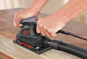 Во время шлифовки инструмент удерживают обеими руками, равномерно придавливая абразивную шкурку к заготовке без сильных усилий. Вибрационную машину ведут параллельными дорожками, перехлестывая их, и чередуя движения вперед и назад.