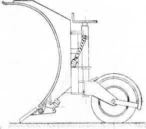 Имеются также навесные плужные снегоочистители, у которых плужный отвал опирается на проезжую часть дороги через опорные колеса, которые при подъеме плуга поднимаются вместе с ним (рис.22). Благодаря этому кромка ножа из синтетического материала получает только незначительное усилие прижима к поверхности покрытия, и тем самым достигается повышенный срок службы отвалов. При уборке плотных слоев снега ножи из упругих материалов не устанавливают, так как они не обладают срезывающим действием, и плуги «всплывают» над слоем снега. Поэтому при уборке плотного снега пользуются сменными металлическими ножами.