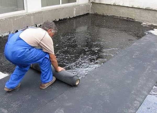 Одним из самых простых способов укладки гидроизоляционного ковра, является приклеивание рубероида на битумную мастику. Для этого понадобится грунтовка на основе битума или так называемый праймер. Который необходим, чтобы увеличить силу сцепления (адгезию) рулонного материала к поверхности из бетона или цементно-песчаного раствора. Посмотрите на фото как выглядит этот процесс.
