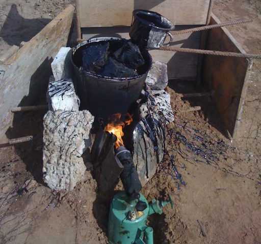 Что касается пропорций, то на 8 кг битума приходится 1,5 кг сухой добавки и 0,5 кг отработанного масла. Весь процесс варки должен проводиться на медленном огне, примерная температура там составит 200 градусов Цельсия, а времени потребуется около 3 часов.