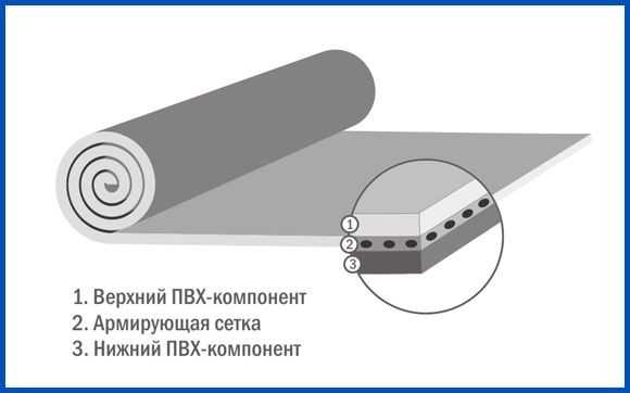 - ПВХ мембраны. Поливинилхлорид – популярный полимер, используемый для производства гидроизоляционных пленок. Чтобы улучшить его свойства в состав вводятся пластификаторы, применяется армирующая сетка, придающая полотну прочность. ПВХ мембраны отличает относительно низка цена по сравнению с аналогами, а также технология монтажа, позволяющая получить практически бесшовное покрытие, при этом сократив слои материала до 1-2.