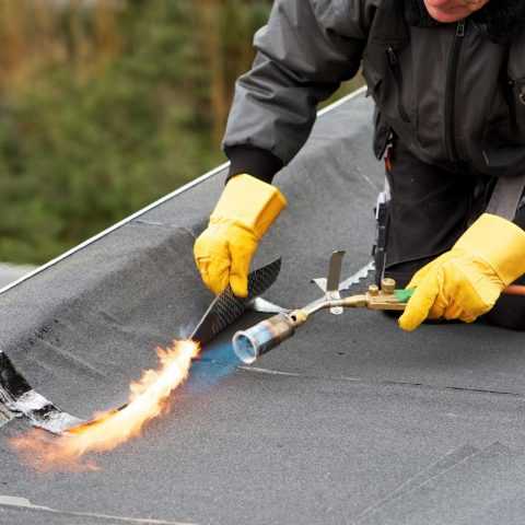 - Наплавляемая. Такие покрытия приклеиваются к обрешетке с помощью газовой горелки, расправляющей нижний слой легкоплавкого битума. Слои наплавляются друг на друга, пока не получится прочное покрытие, защищающее от влаги. Наплавляемая кровля должна монтироваться на негорючее основание из-за высокого риска возгораний.