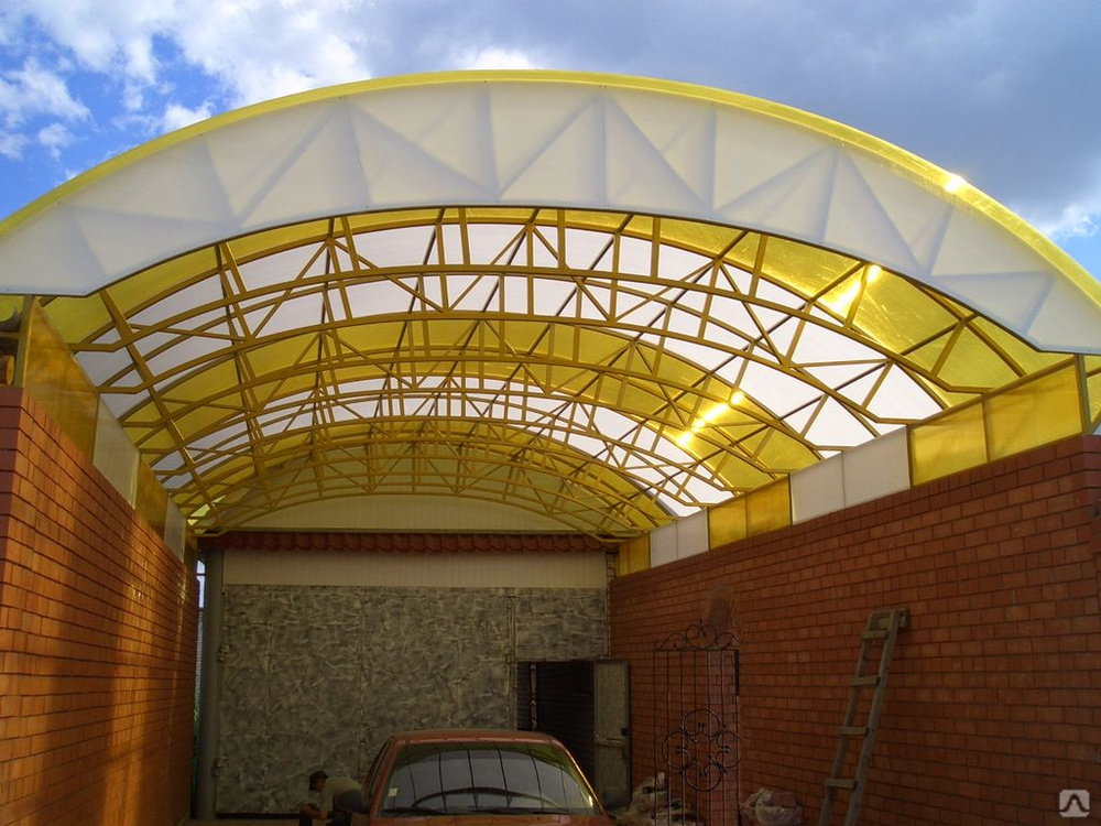 Посмотрите на представляющее арочные навесы из поликарбоната фото — они действительно практичны и красиво выглядят. За счёт полукруглой конструкции проблема с наледью в весеннее время полностью решена: вода просто не будет задерживаться на такой кровле;