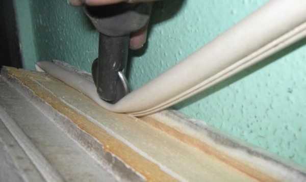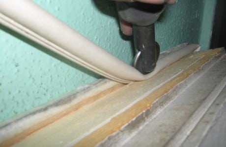 С уплотнителем работать еще проще. Поверхность очищается от пыли и грязи, поролоновый герметик аккуратно укладывается в щели, при этом его можно слегка утрамбовать шпателем. Но уплотнитель нельзя растягивать, иначе он потеряет свои положительные технические характеристики. Затем герметик обклеивают строительным скотчем.