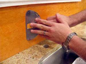 При железнении венецианской штукатурки надо внимательно следить за тем, чтобы не образовывались царапины, сдиры. Для этого на кельме не должно быть песчинок, крупиц материала и т.д. Также надо гладить стену плоскостью кельмы, не задевая ее краями. Обрабатываем за один раз небольшой участок, когда на нем проступит рисунок, передвигаемся на другой участок, не забывая уделять внимание границам двух участков.