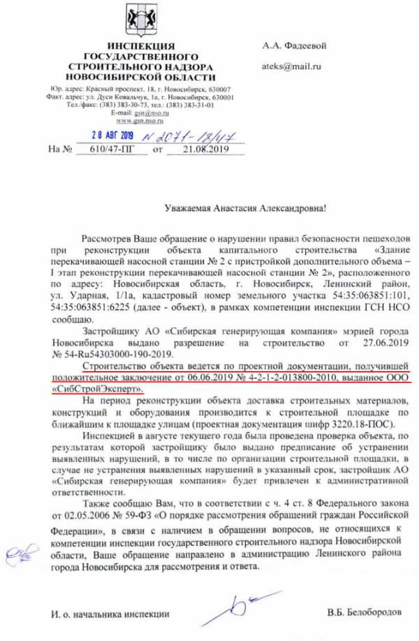 Местная жительница Анастасия Фадеева прислала в редакцию «Вестей» ответ из Инспекции Государственного строительного надзора Новосибирской области. Ранее женщина жаловалась на нарушение правил безопасности при реконструкции того самого объекта на улице Ударной 1/1а. Ответ местной жительнице пришел сегодня — в день обрушения, когда ЧП уже произошло и спасатели уже искали пострадавших. Публикуем официальный документ.