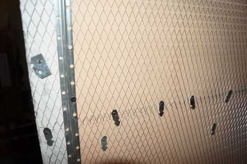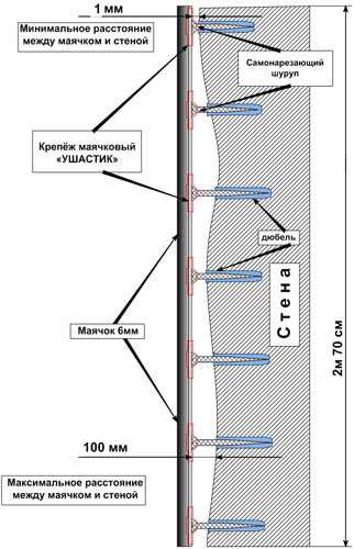 - По углам вверху и внизу ставится крепление под шнур, обычно это дюбеля, забиваются в просверленное отверстие 8 мм. Затем добавляется крепеж на середине высоты.