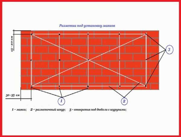 Он подразумевает монтаж маячков на раствор, которым будут отделывать поверхность. Инструкция по разметке: