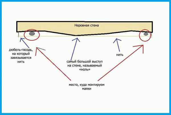 Вдоль стены на разных уровнях потребуется натянуть нитку. Это позволить понять, насколько поверхность ровная: