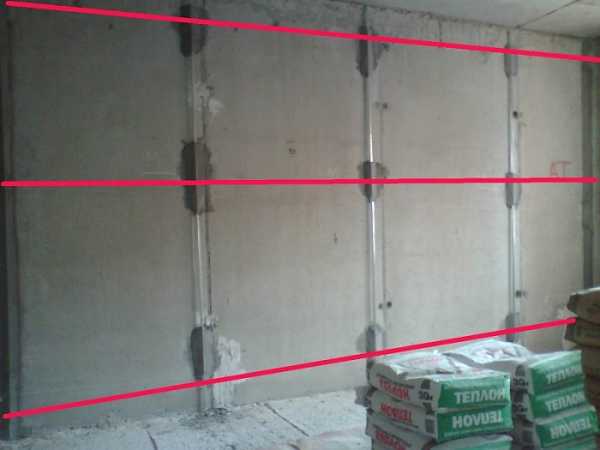 Размечают расположение маяков так чтоб расстояние по ширине между ними было меньше, чем у правила которым стягивают раствор, сантиметров на 15 . По горизонтали натягивают шнурку для того чтобы маяки были установлены в одной горизонтальной плоскости.