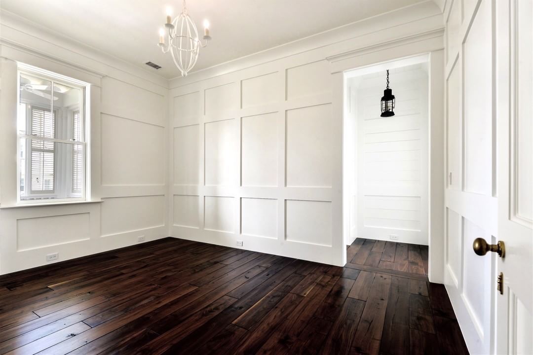 Покрасьте панели и стену выбранным цветом. На данный момент нам нравятся темно-зеленые цвета, такие как Green Smoke от Farrow & Ball, как показано в визуализаторе.