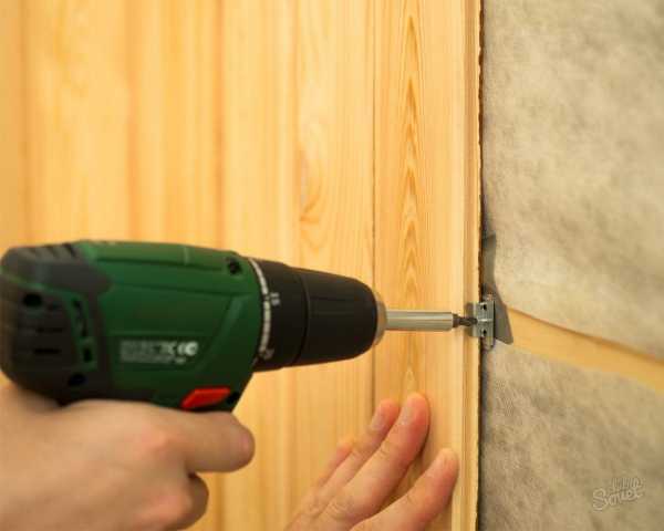 - В углу должен оказаться шип детали, после чего в паз необходимо вставить заранее приготовленный кляймер (по всей длине их необходимо будет использовать в среднем от четырех до шести). Кляймер прикручивается к деревянной обрешетке с помощью шуруповерта. Противоположный край крепится проще – для этого достаточно использовать обычные саморезы под гипсокартон. Чтобы шляпки не торчали, воспользуйтесь сверлом (8-10 миллиметров в диаметре), проделав под них пазы.