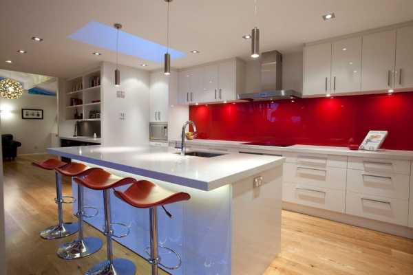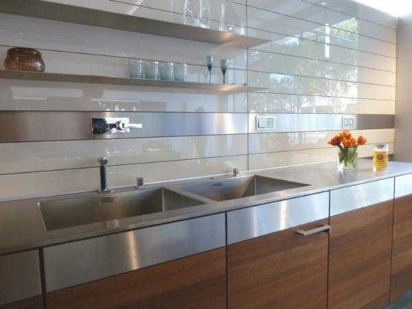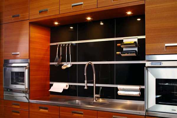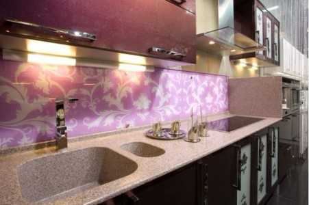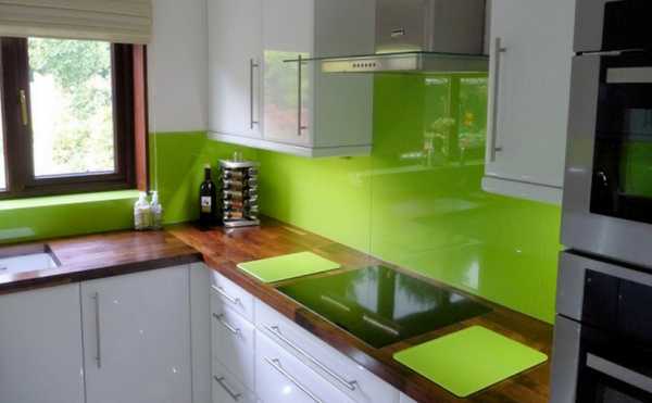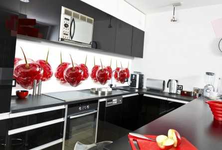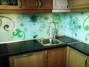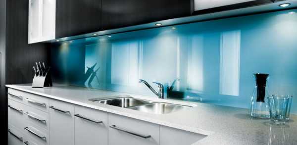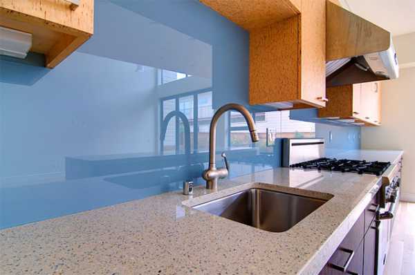 - Стеклянные стеновые панели для кухни, применяемые в основном для обустройства рабочих стен кухни, являются достаточно прочными относительно воздействия влаги и нагрева, если используется закаленное стекло.