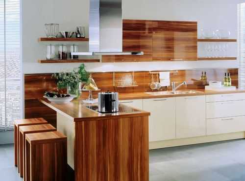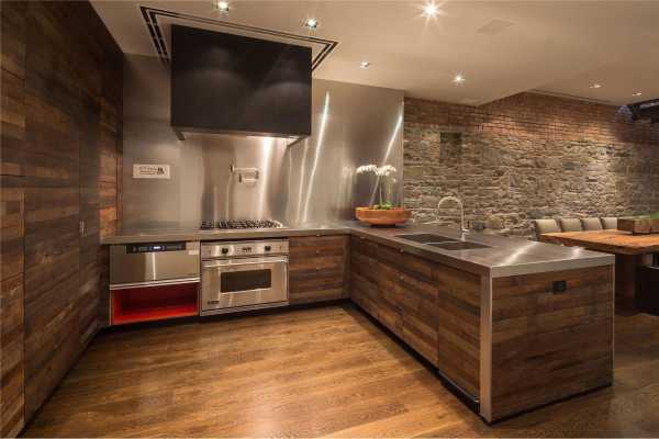 - Массив дерева ─ прекрасный материал для создания особой атмосферы в просторной кухне. Такие панели в интерьере смотрятся дорого, как на фото ниже, но для придания им влагоустойчивых свойств древесину следует обработать. Повышенная влажность способна не просто разрушить отделку стен, но и создать благоприятные условия для размножения бактерий и грибка.