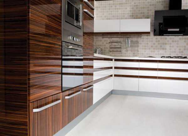 - Для оригинальности дизайна можно комбинировать 2 вида изделий – со шпоновым покрытием и акриловым, которое создает красивую глянцевую поверхность.
