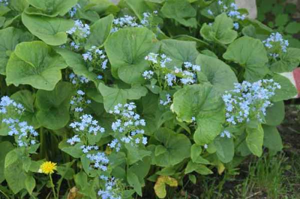 Brunnera – Бруннера, Незабудочник (b. macrophylla – бруннера крупнолистная; b. sibirica — бруннера сибирская — цветки синие).