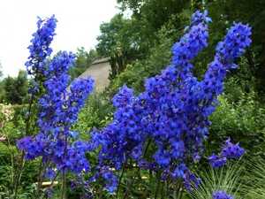 Дельфиниум имеет много сортов голубого, синего или фиолетового цвета. Он зажигает свои соцветия, словно диковинные свечи, в середине июня. Этот многолетник каждый сезон цветет все пышнее. А если не пересаживать его, то цветков будет еще больше с каждым годом.