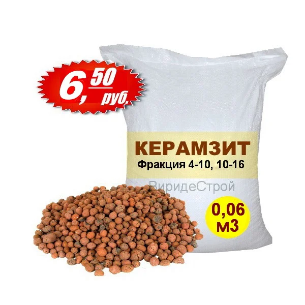 Керамзит в мешках, объем 0,07 м3, в 1 м3 ― 14 мешков, фракция 0-4 мм, 4-10 мм, 10-16 мм. Керамзит применяется в качестве утеплителя полов, перекрытий, наружных стен и перегородок, чердаков, кровли, мансардных этажей. В работах широко используется для выполнения стяжки пола, в том числе и сухой по технологии Кнауф, для заливки легких бетонов, для засыпки между лагами при монтаже деревянных полов, в производстве строительных материалов, для благоустройства и ландшафтного дизайна участков. Керамзит в мешках экологически чистый материал, который обладает высокими полезными качествами ― низкая теплопроводность, небольшой вес, хорошая звукозащита, влагопоглощение и паропоглощение, что особенно важно при заливке полов на первом этаже, невысокая цена.