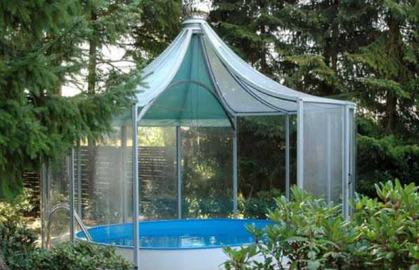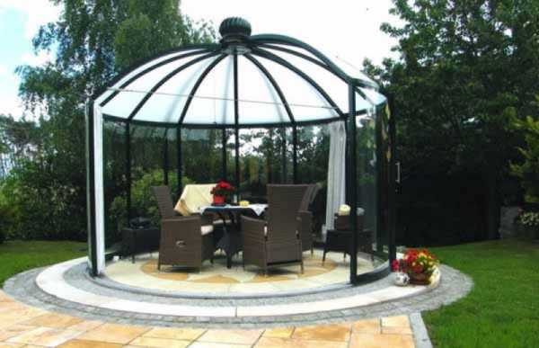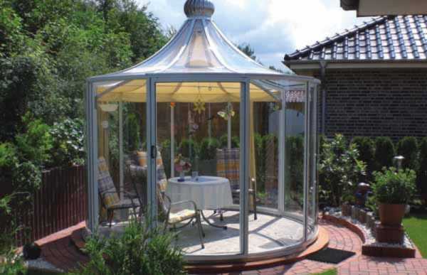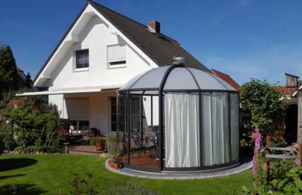 Например, эта металлическая беседка из алюминиевого профиля состоит из двух полукругов, которые можно перемещать по круглой направляющей и которые дают гибкие возможности с какой стороны оставить крытую и открытую зоны.