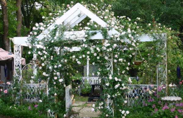 Эта белоснежная ажурная беседка эффектно выделяется на фоне сада, в сочетании с рядом растущими светлыми розами, она осветляет пространство этого небольшого садового участка.