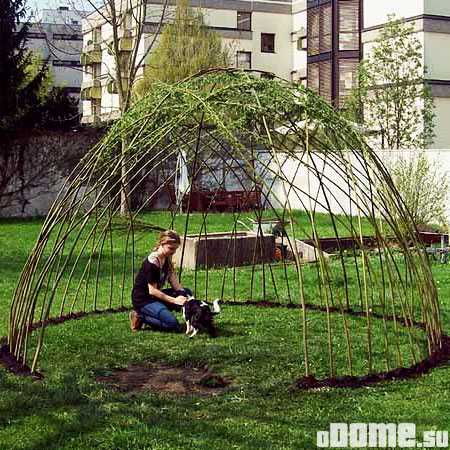 Конструируется из подручных средств (железные прутья, длинные ветки деревьев). Далее надо высадить по периметру каркаса то растение, которым он будет обрастать. Чаще всего это виноградная лоза или можжевельник.