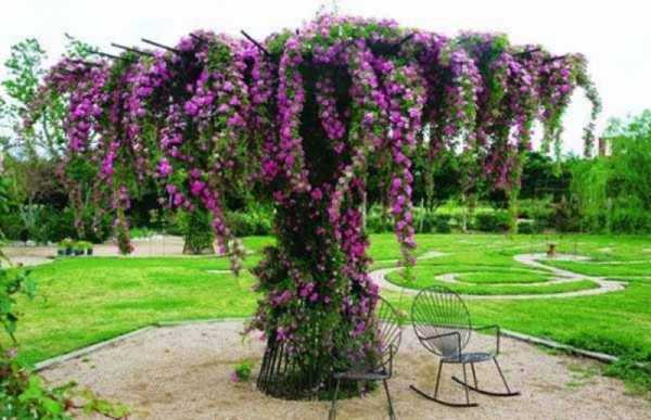 Садовые беседки на даче часто служат опорой для вьющихся растений. Посмотрите как красива эта беседка из металла обвитая цветами.