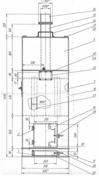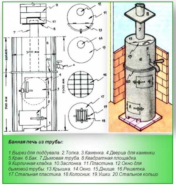 Основная задача, которую необходимо решить в этом случае, состоит в том, чтобы найти трубу подходящего диаметра (0,5-0,6 метра) с толщиной стенки от 5 до 10 мм и высотой 1,6 метра. Эта труба делится на три части, причём секция длиной 0,6 метра предназначается для водяного бака, а две секции по 0,8 метра пойдут на топку и каменку. Из оставшихся заготовок можно будет сделать дверцы для топки и поддувала. Все эти элементы печи и их размеры указаны на приводимом здесь чертеже.