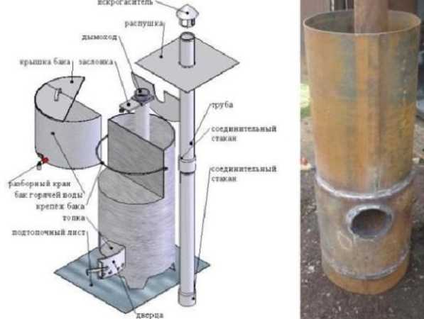 Своими руками ее несложно изготовить из металлической трубы. Печь представляет собой корпус, в верхней части которого (над топкой) расположена каменка закрытого типа. Над ней – емкость для нагрева воды. Рисунок хорошо поясняет все конструктивные особенности модели.
