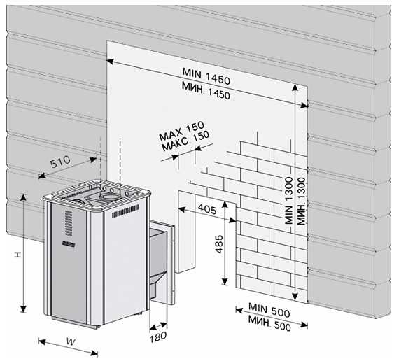 - Минимальное отстояние от стен (если не предусмотрен монтаж теплоотражающего экрана) – 1 м.