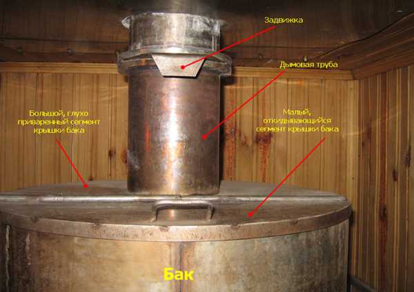 Обратите внимание! Отверстие под дымоходную трубу должно быть несколько смещено к задней стенке. Сверху приваривается пластина с отверстием под дымоход, закрывающая лишь половину верхней окружности бака. Оставшаяся незакрытой часть используется для заливки воды и закрывается во время её нагрева специальной крышкой с ручкой.