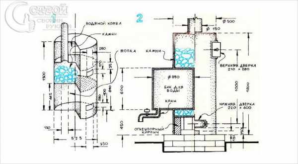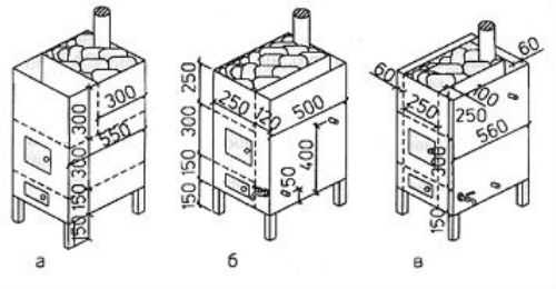 Если внимательно рассмотреть чертежи банных печей из металла с размерами, то их по конструкционному решению можно разделить на несколько разновидностей: