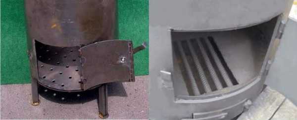 Над зольником делается отверстие для топочной дверцы. Теперь перегородка с колосниковой решеткой. По диаметру вырезается блин из металла, а в центре делается вырез, который заваривается прутьями арматуры. После того, как перегородка приварена на положенное место, время устанавливать дверцы и щеколды.