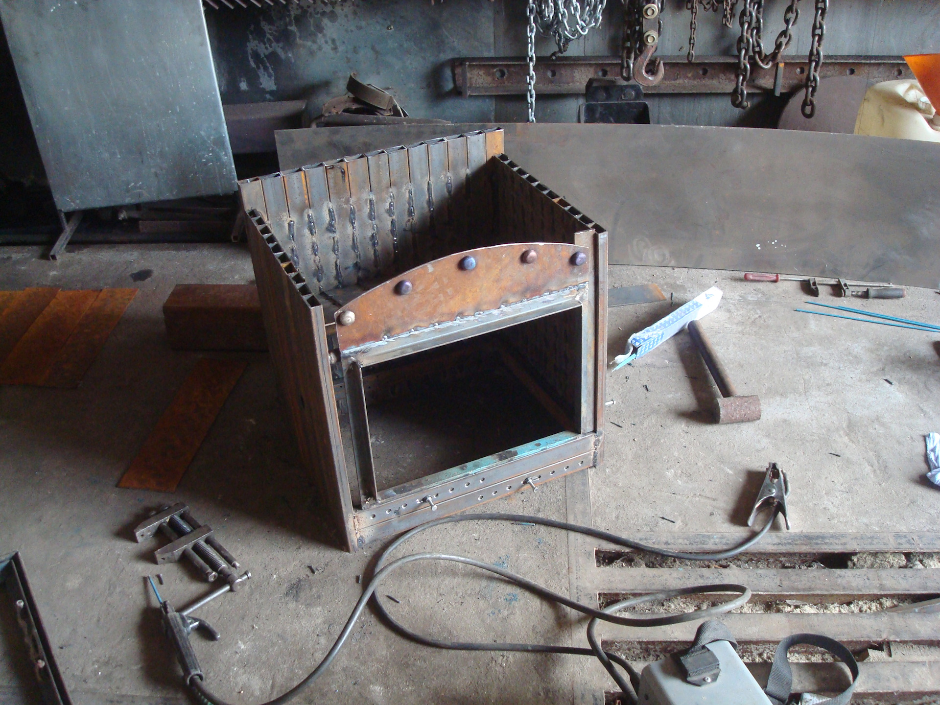 Я делаю внешний корпус духовки из листового металла 18-го калибра, извлеченного из дверей, в которых я вырезал окна, во время своей старой повседневной работы. Я разрезал части и скрепил их вместе, чтобы кирпичи плотно вошли внутрь, а затем просто скрепил части вместе с помощью сварочного аппарата: