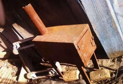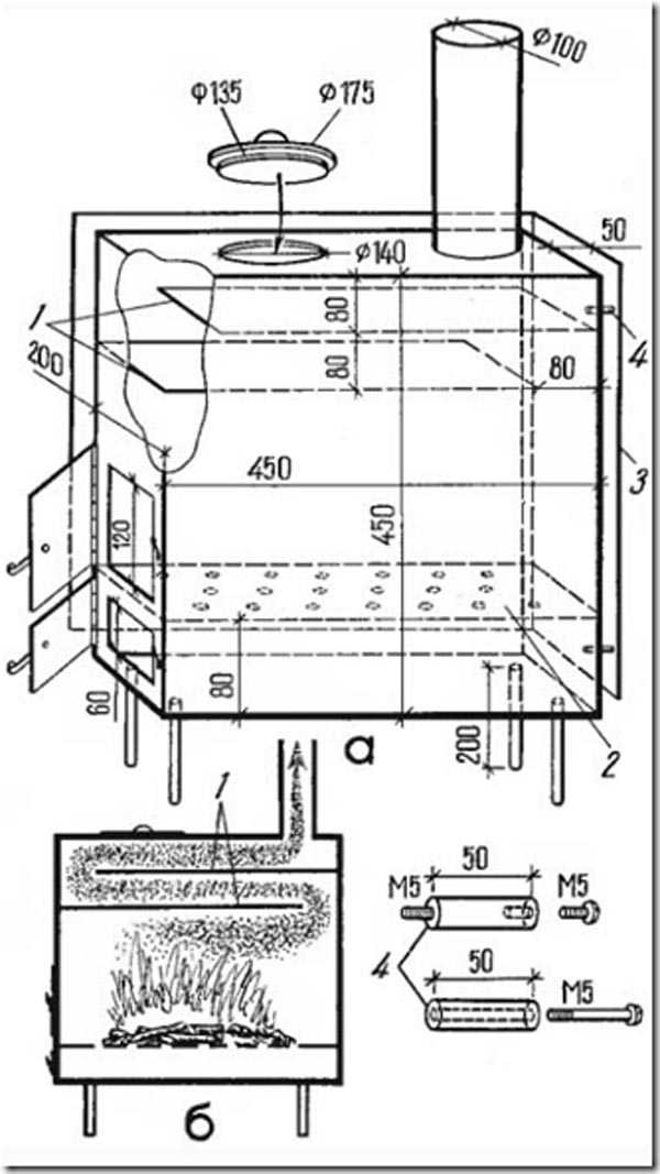 Если отсутствует труба, из железных листов сваривает корпус характерной формы. Проемы для топки и поддувала располагаются на одной оси на расстоянии 10 см друг от друга. Внизу печки устанавливается дверца поддувала, над ней задвижка топочного отсека.