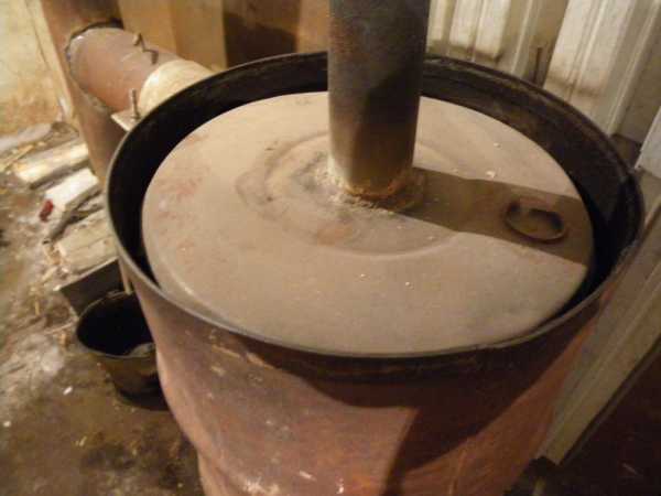 Внизу бочки вырезают отверстия для люков подачи дров и зольника. Они должны закрываться плотно, чтобы исключить попадание туда воздуха, так как подаваться он должен через трубу в поршне. Устанавливают всю конструкцию на бетонный фундамент или кирпичную кладку.