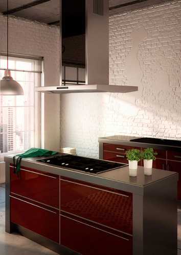 - Островные – вытяжки крепятся к потолку и не контактируют со стенами. Такие модели хорошо смотрятся на просторных кухнях с рабочей зоной в центре комнаты.